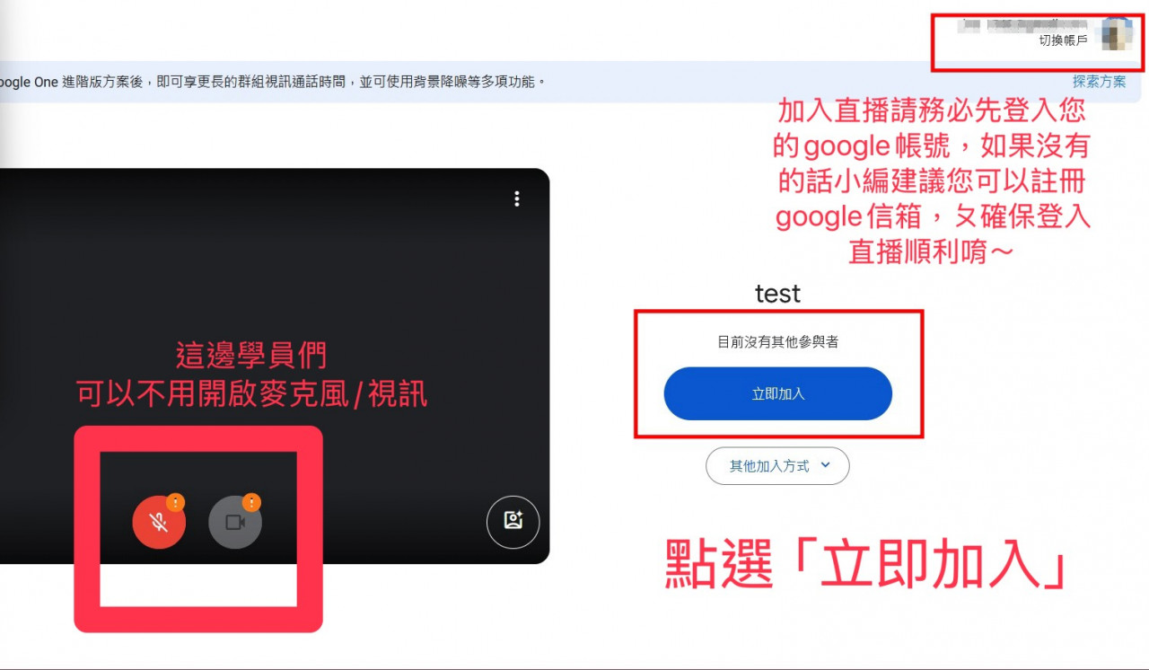 A:不用下載特定軟體,直接搜尋這邊網站並按照上面步驟觀看即可,但是使用並加入google meet需要有gmail帳號,小編建議沒有gmail帳號的同學可以註冊一個喔!