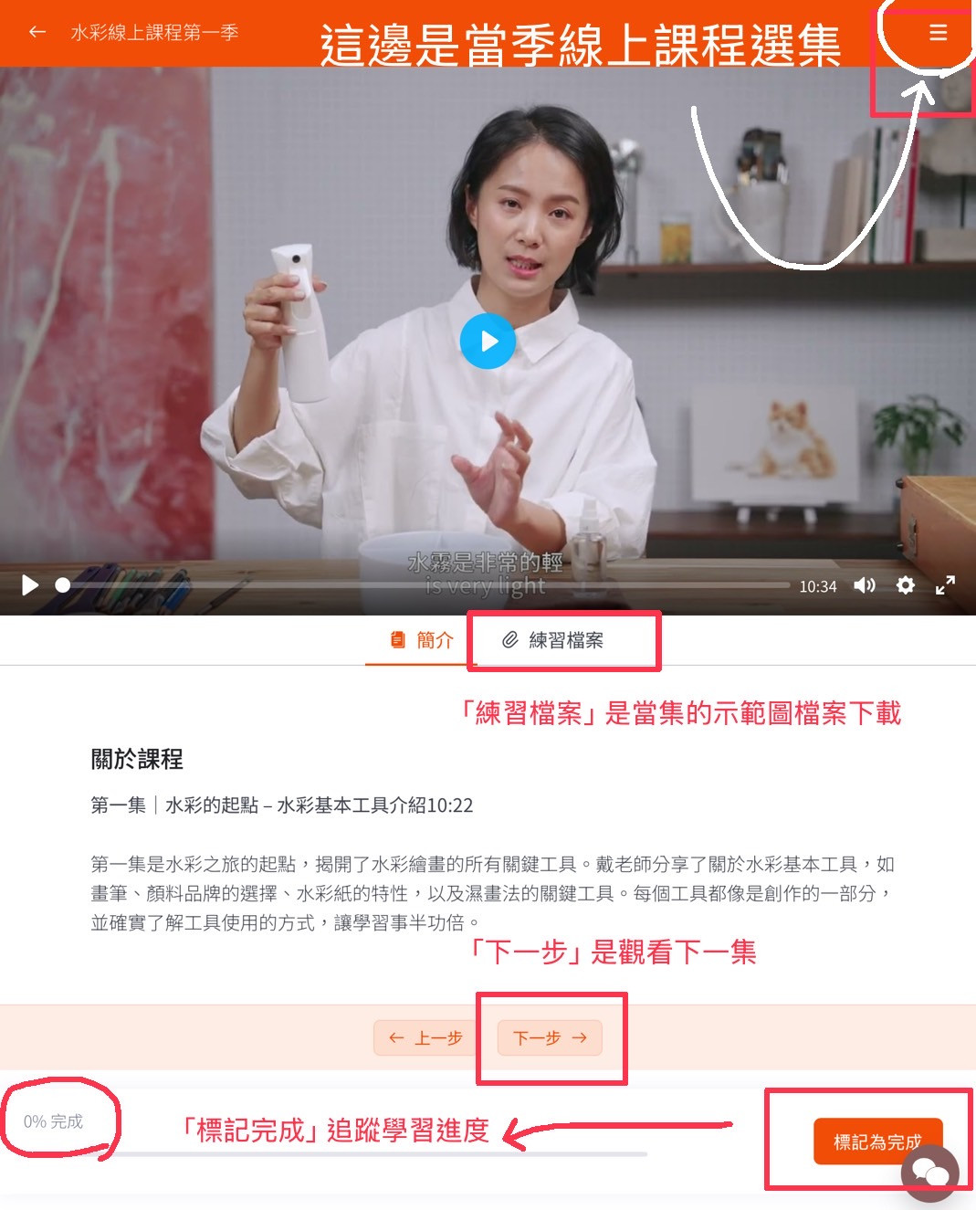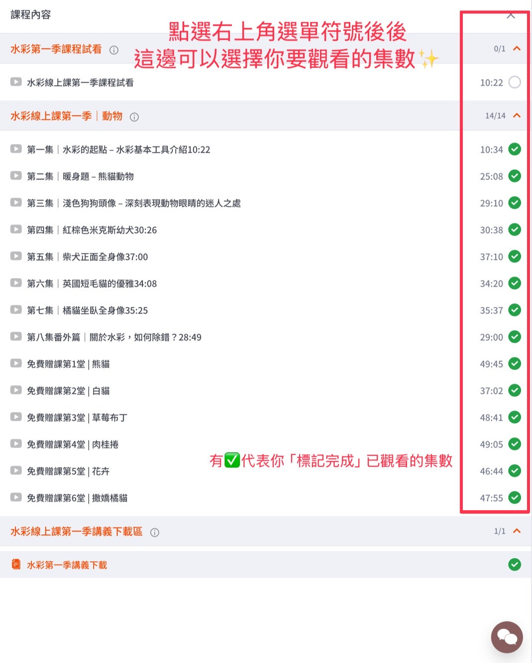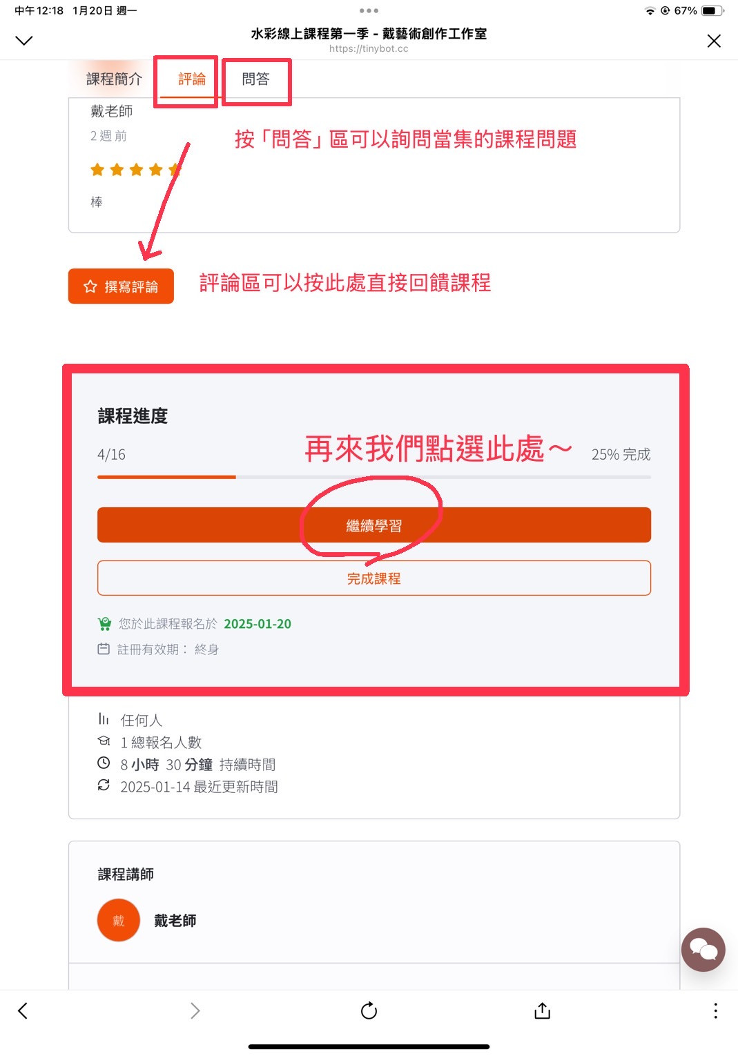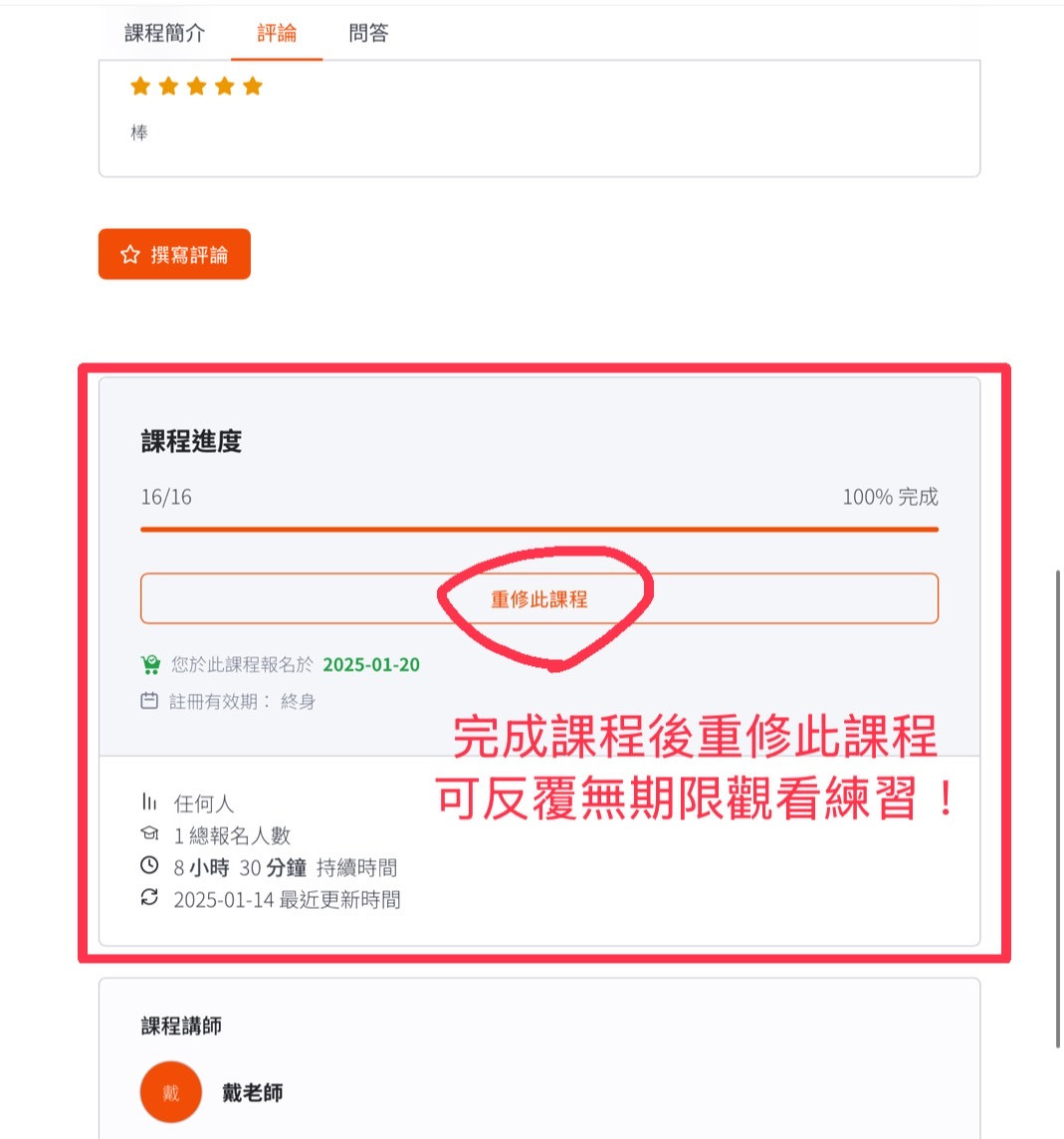 問答區可以直接詢問當季任何有問題的地方,評論區則可以撰寫您對線上課程的回饋,課程進度的部分假如不小心按到完成課程也不用緊張~請參考最後一張圖片重修課程