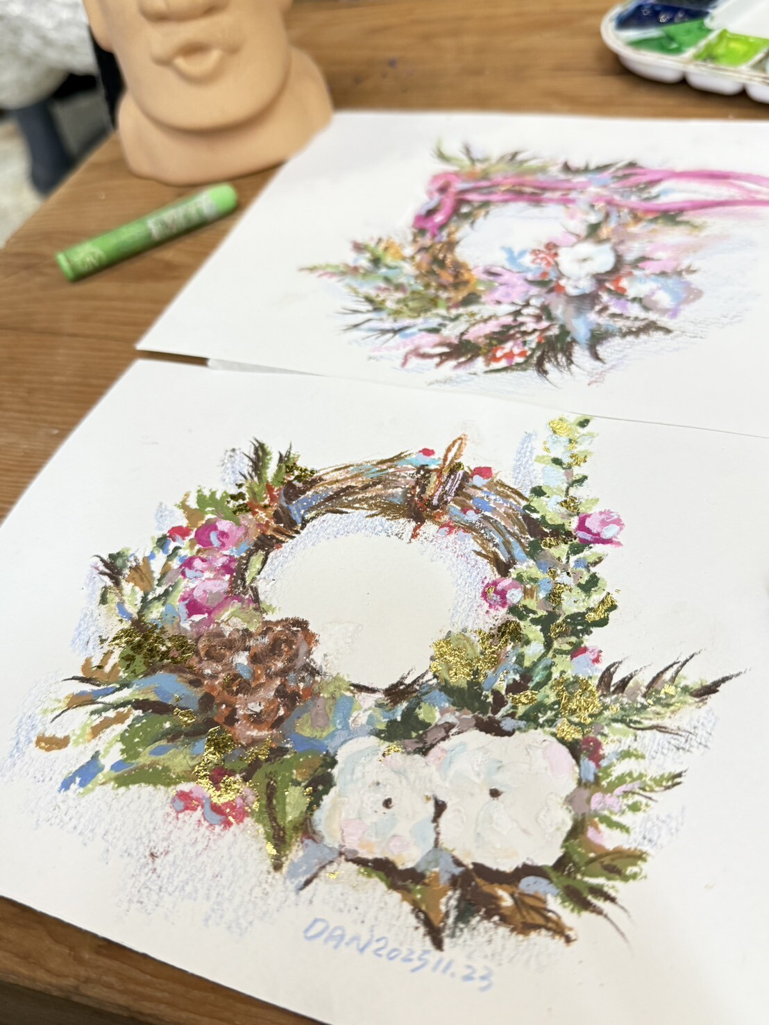 這一次,我們以 水彩的透明層次 結合 油性粉彩的溫潤質地,